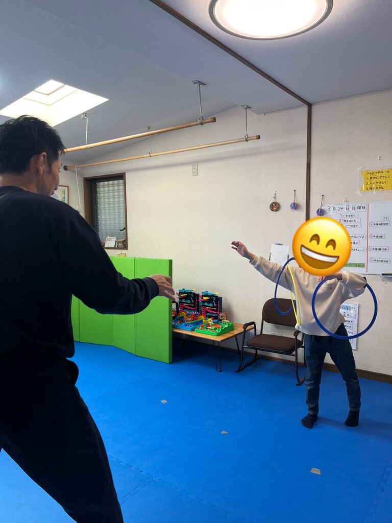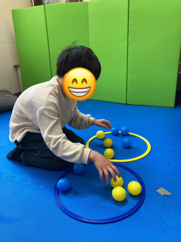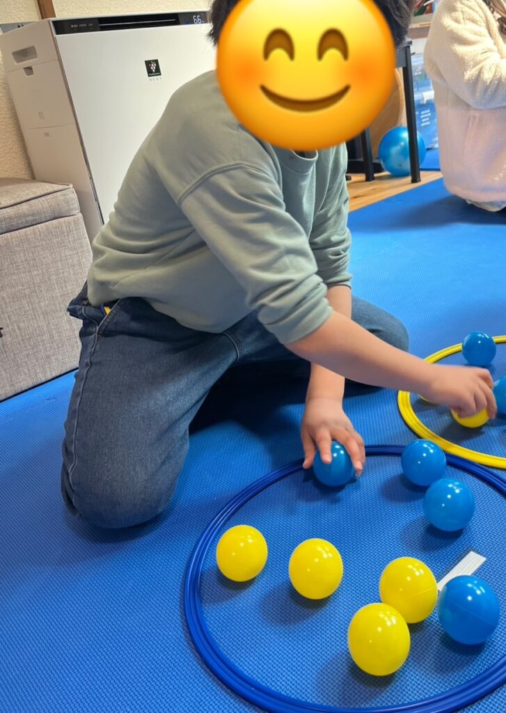 今日は,エクササイズタイムでビジョントレーニングを中心に行いました。フープを手や足でキャッチしたり,色別に分けられたボールを同時に入れ替えるトレーニングを行いました。