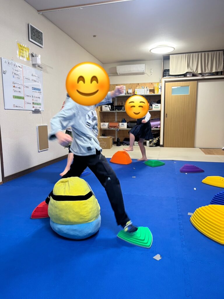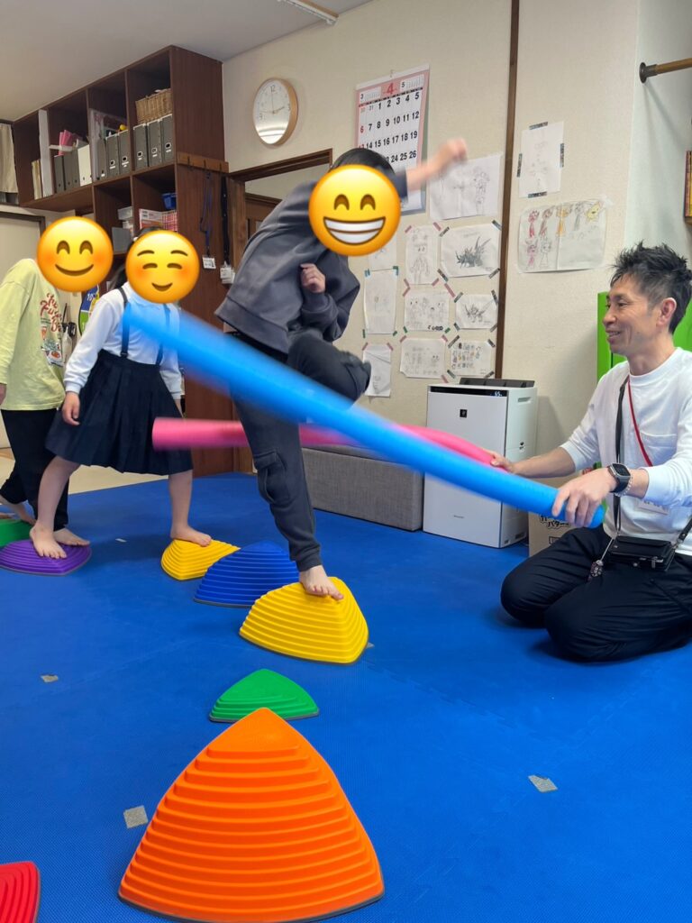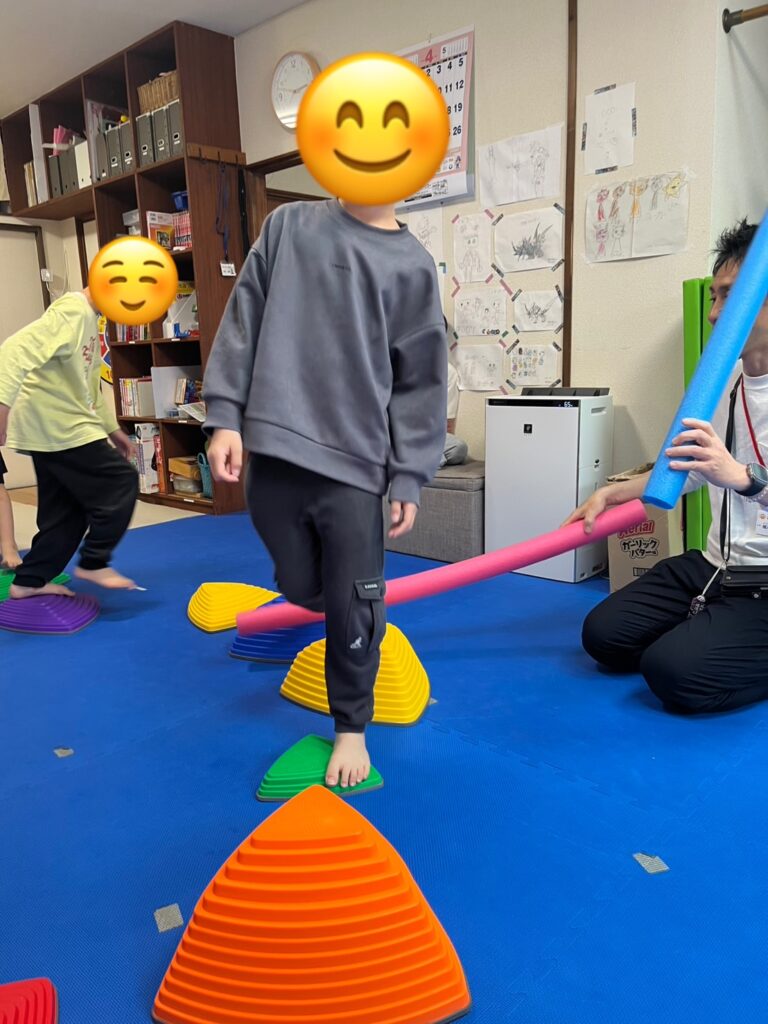 バランスストーンの上をただ歩くだけでなく,プールスティックを使ったビジョントレーニングも取り入れたことで,よりゲーム性が増し,楽しみながら何度も挑戦する子ども達でした。