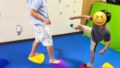 今日のエクササイズは,ケンパー跳びとトランポリンを行いました。片足跳びと両足跳びの違いを使い分けて,リズム良く跳んでいきます。始めはぎこちなったのですが,繰り返すたびに,リズム良く楽しく跳ぶことができるようになりました。