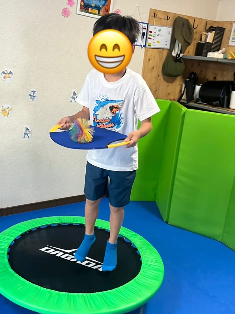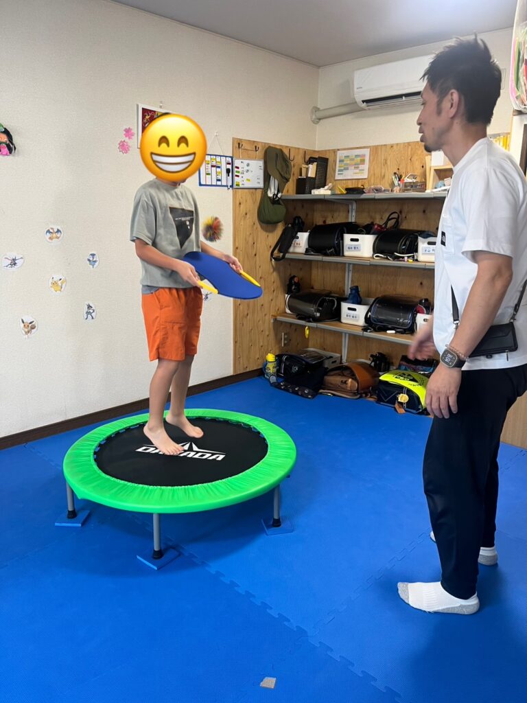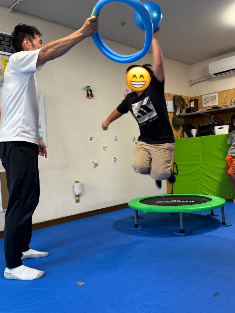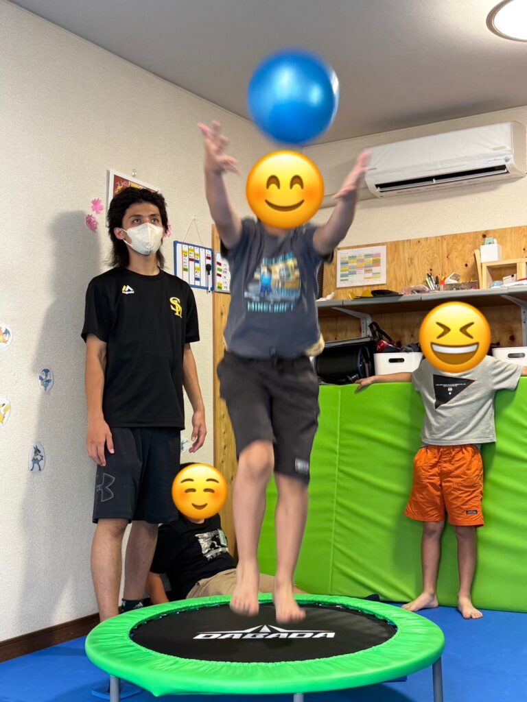 今日も,トランポリンエクササイズを通して,体幹トレーニングや目と手の協応トレーニング,ジャンプトレーニングをみんなで楽しく行いました。