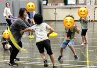 エアコンが効いたホールでは,風船が宙に浮いている時だけ走れる「だるまさんが転んだ風船ver.」や鬼のプールスティックから避けながら,鬼の背中についたスカーフを奪い取る「プールスティック鬼ごっこver.2」,二人組になってじゃんけんをして,勝ったらプールスティックで相手を叩いて,負けたら叩かれないように逃げる「叩いて,逃げてじゃんけんポン」をしました。