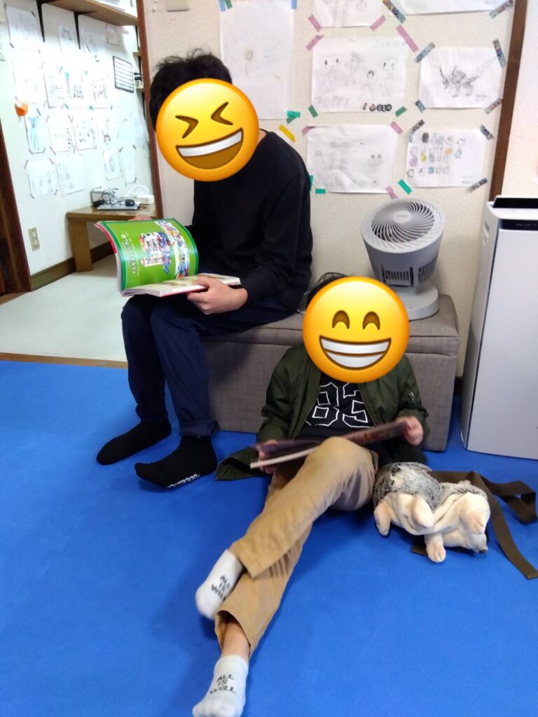 まずは学校の宿題に取り組み,その後はエクササイズタイムです。今日は,言われた方向へ素早く動く反応エクササイズとスライドパズルに取り組みました。