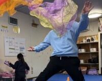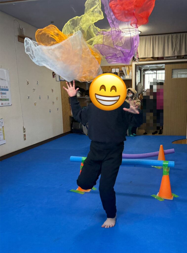さて,今日のエクササイズは,スカーフキャッチPart2です。1つだけだったミニハードルが2つに増えて連続ジャンプをしながらスカーフをキャッチします。