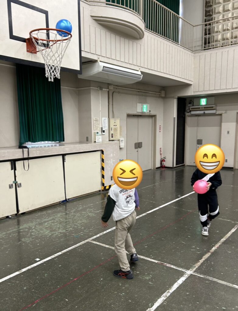 ボールが手から離れた時だけ動ける「だるまさんが転んだ」,みんなが大好き「プールスティック鬼ごっこ」,ペアでジャンケンをして勝った方がプールスティックで相手を叩く「叩いて逃げてジャンケンポン」や「フルーツバスケット」等で楽しみました。これらの活動は,仲間と楽しく関わり合って遊ぶだけでなく,目で見て動く力,思考力,判断力,反応力を育みます。