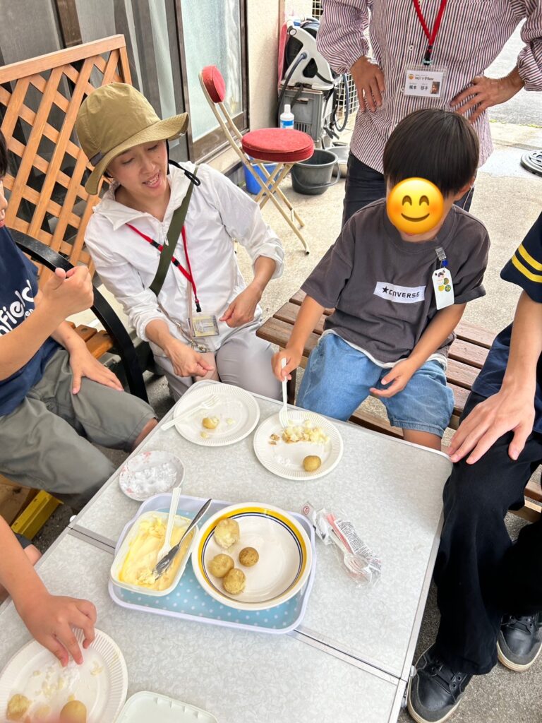 ジャガイモ掘りの後は,採れたてのジャガイモを蒸してくれて,熱々ホクホクのジャガイモをみんなでいただきました♪