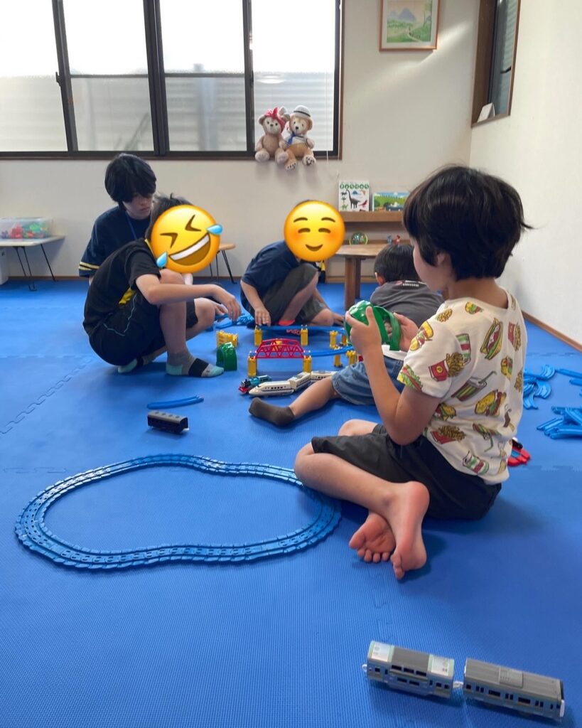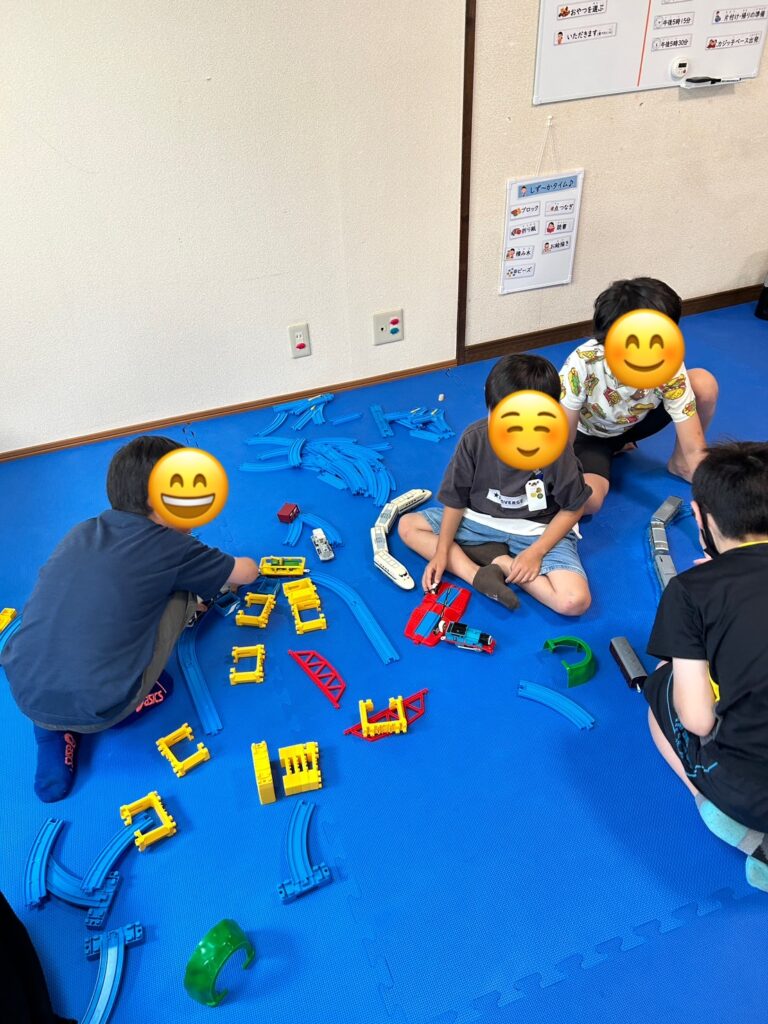 今日の「選択遊び」では,Kajiッ子Baseに新しく増えたおもちゃ「プラレール」にみんな大興奮でした♪1人1人が思い思いのレールを組み合わせて列車を走らせて楽しむことができました。