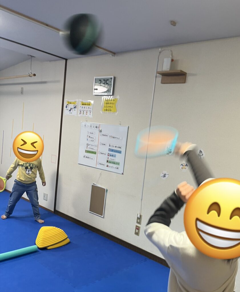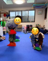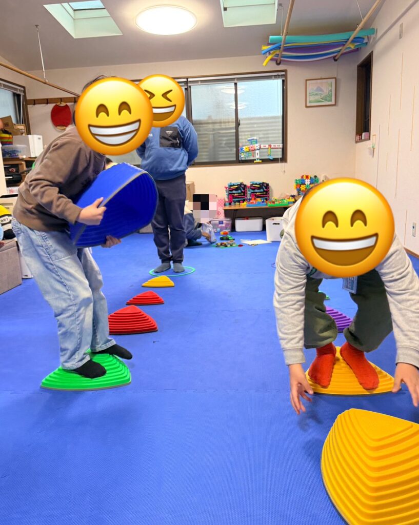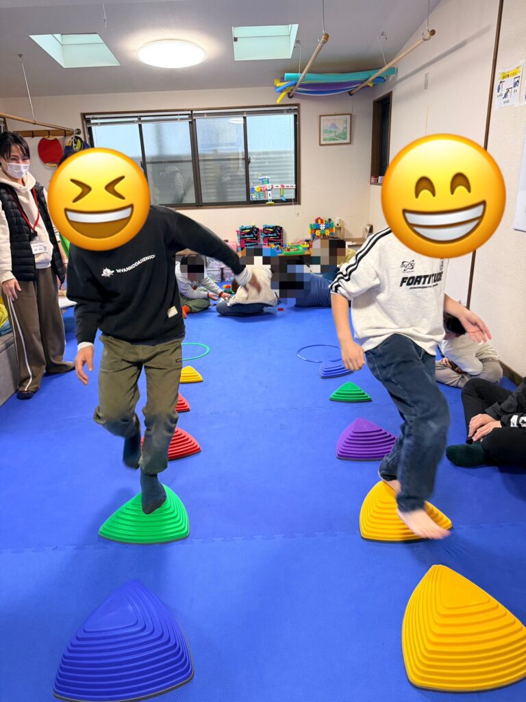 足裏感覚や体幹の安定,重心コントロールが自然と鍛えられ,さらに「落ちないように」「どう持てば安定するか」を考える力も育ちます。仲間と競い合いながら意欲的に取り組むことができました♪