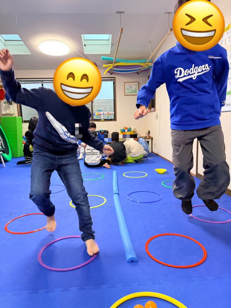 一見簡単そうに見えますが,ジグザグのフープを見て跳び進むことで,視線のコントロールや距離感の調整が自然と養われます。また,両足ジャンプで進むことにより,体幹の安定や下肢の筋力アップにもつながります。私もやってみたのですが,思った以上にハードな活動でした。子ども達は,互いに競い合って意欲的に何度も挑戦しており,子ども達の体力に改めて驚かされました!