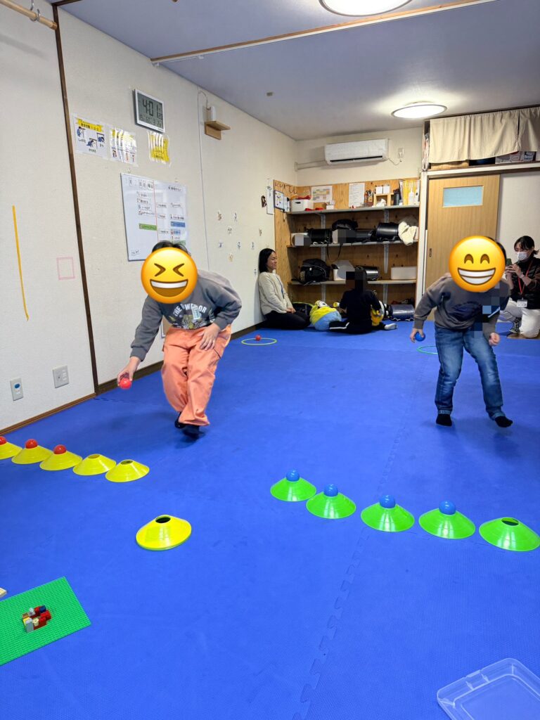 さて,今日のエクササイズは,マーカーを使って,足したら10になるペア探しをしたり,ボール運びをしたりしました。