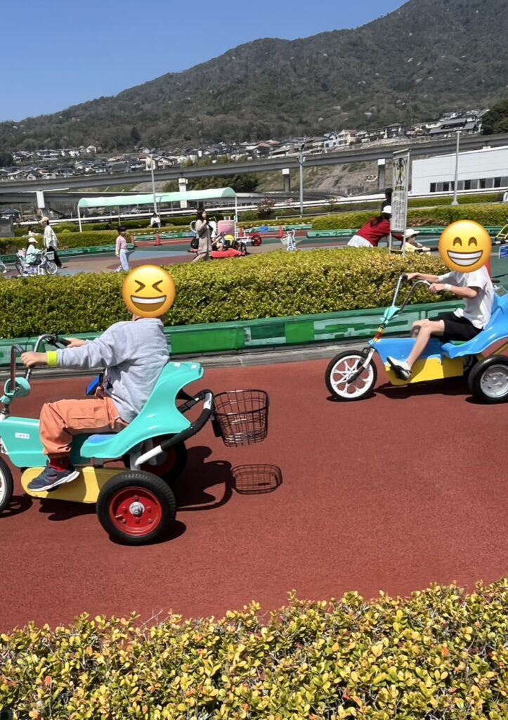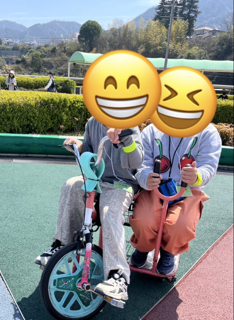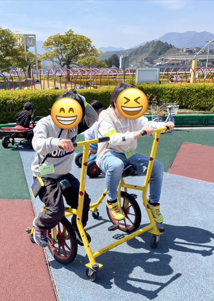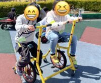 おもしろ自転車は,1人乗り用から数人で乗れる自転車まで多数あり,みんなとっかえひっかえしながら自転車を楽しみました。特に2人乗りの自転車には,タイミングを合わせて協力しないといけない自転車もあり,声をかけ合いながら楽しんでいました。
