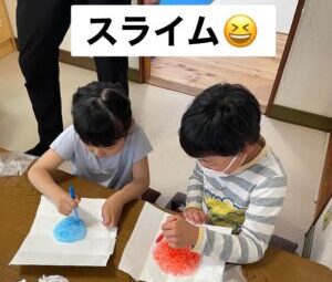 今日は図画工作タイムでスライム作りを行いました♪久しぶりにみんなでするスライム作りに「懐かしい~♪」と楽しみな様子の子ども達でした。手順を確認して手際よく作っていきます。水性ペンで好きな色を付けて,オリジナルスライムの完成です。スライム作り...